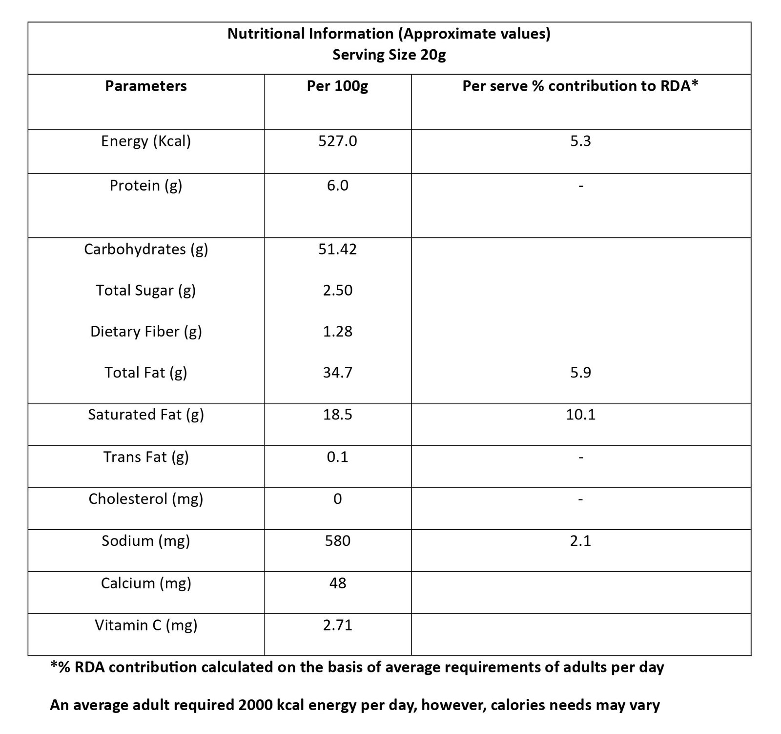 Rice Flour (42.1%), Corn Flour (19.1%), Gram Flour (3.8%), Edible Vegetable Oil (Palmolein Oil and/or Cottonseed Oil), Edible Common Salt, Black Salt, Sugar, Glucose, Chilli, Amchur Powder, Cumin, Black Pepper, Dry Ginger, Clove, Nutmeg, Cardamom, Cinnamon, Asafoetida, Dehydrated Vegetable Powder (Tomato, Tamarind, Garlic, Onion), Spices & Herbs (Chilli, Pepper, Parsley), Hydrolyzed Vegetable Protein (Soya), Acidity Regulator (INS 296, INS 330).